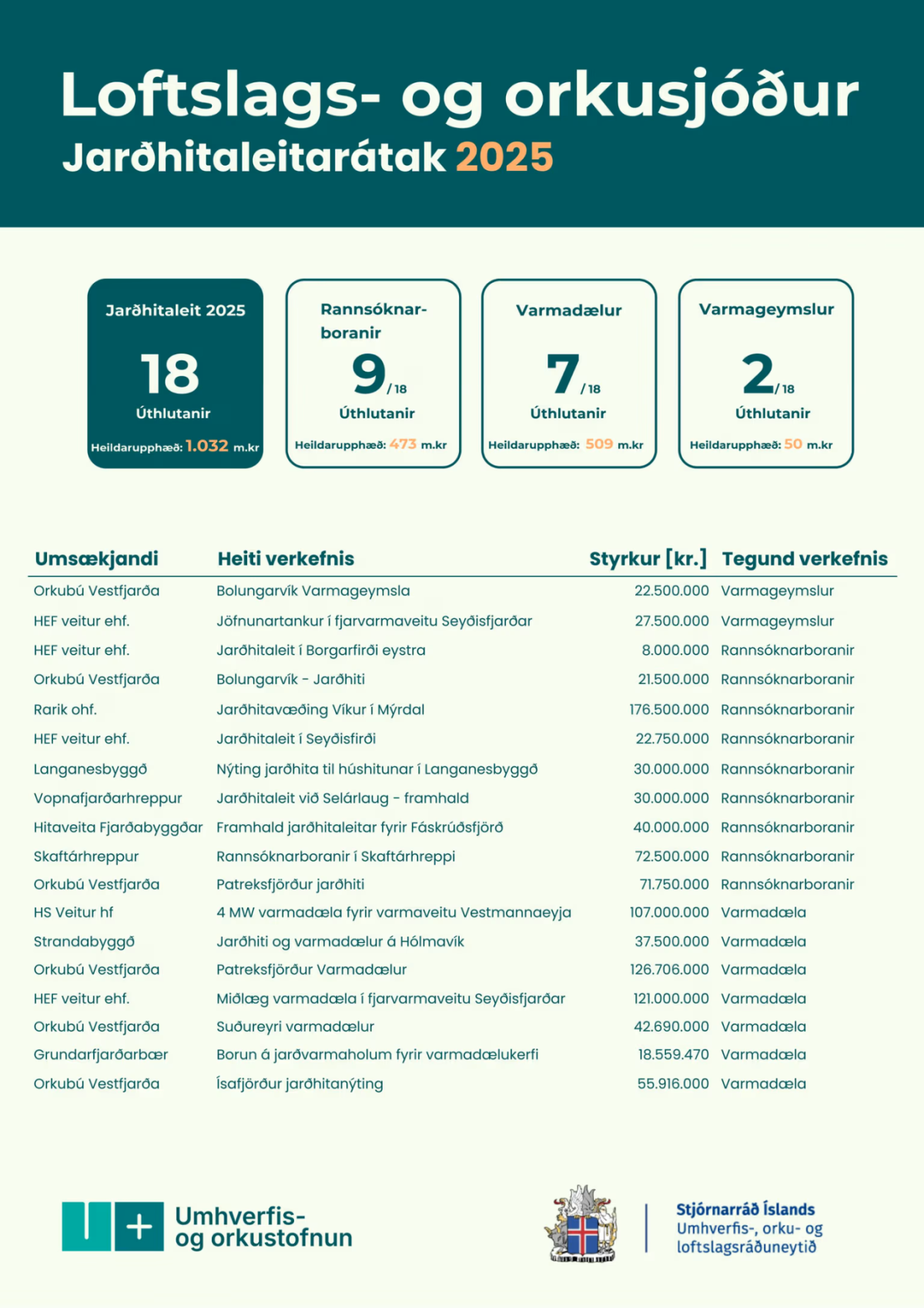 Alls bárust 48 umsóknir í átakið frá sveitarfélögum, orkufyrirtækjum og aðilum í þeirra umboði. Verkefnin voru fjölbreytt en heildarkostnaður verkefna sem sótt var um nam 6.093 m.kr. og sótt var um 4.082 m.kr. í styrki. 18 verkefni hlutu styrk: 8 verkefni sem snúa að jarðhitarannsóknum, 8 verkefni sem tengjast uppsetningu varmadælna og 2 verkefni sem miða að uppbyggingu varmageymslna.
