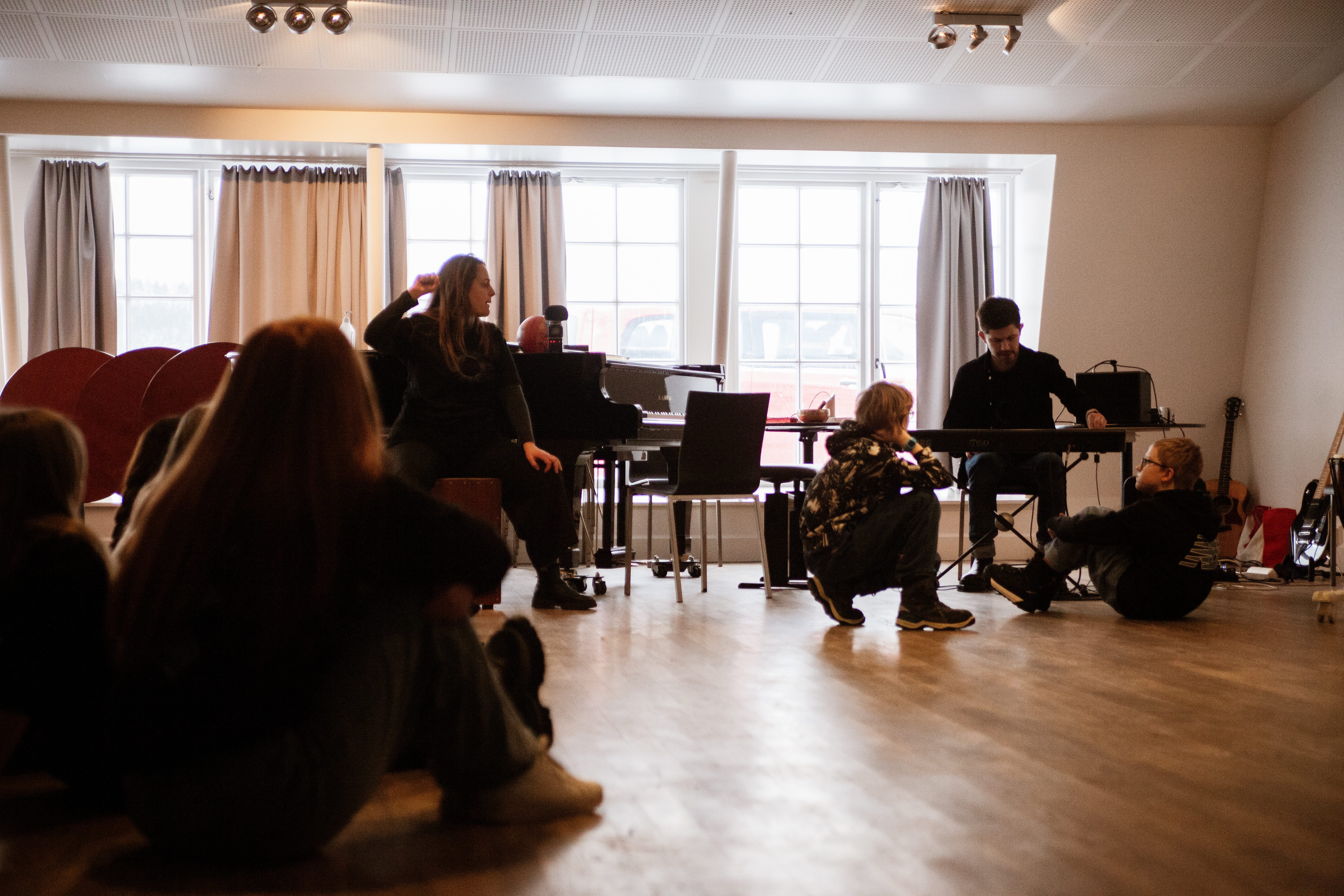 Að fyrirlestri loknum tóku við vinnustofur þar sem allir fengu að taka þátt í skuggaleikhússmiðju með Aude og Emblu frá Þykjó, vísindasmiðju með Sævari og Ninnu frá Þykjó og tónlistarsmiðju með Sigga og Ingibjörgu. Með í för var kvikmyndagerðarmaðurinn Janus Bragi sem myndaði það sem fram fór til að skapa úr því stuttmynd sem sýnd verður þegar Púkinn fer fram dagana 27. apríl-8. maí. Þar mun líka hljóma lag sem Siggi og Ingibjörg hafa sett saman upp úr tónlistarsmiðjunum og útsett.