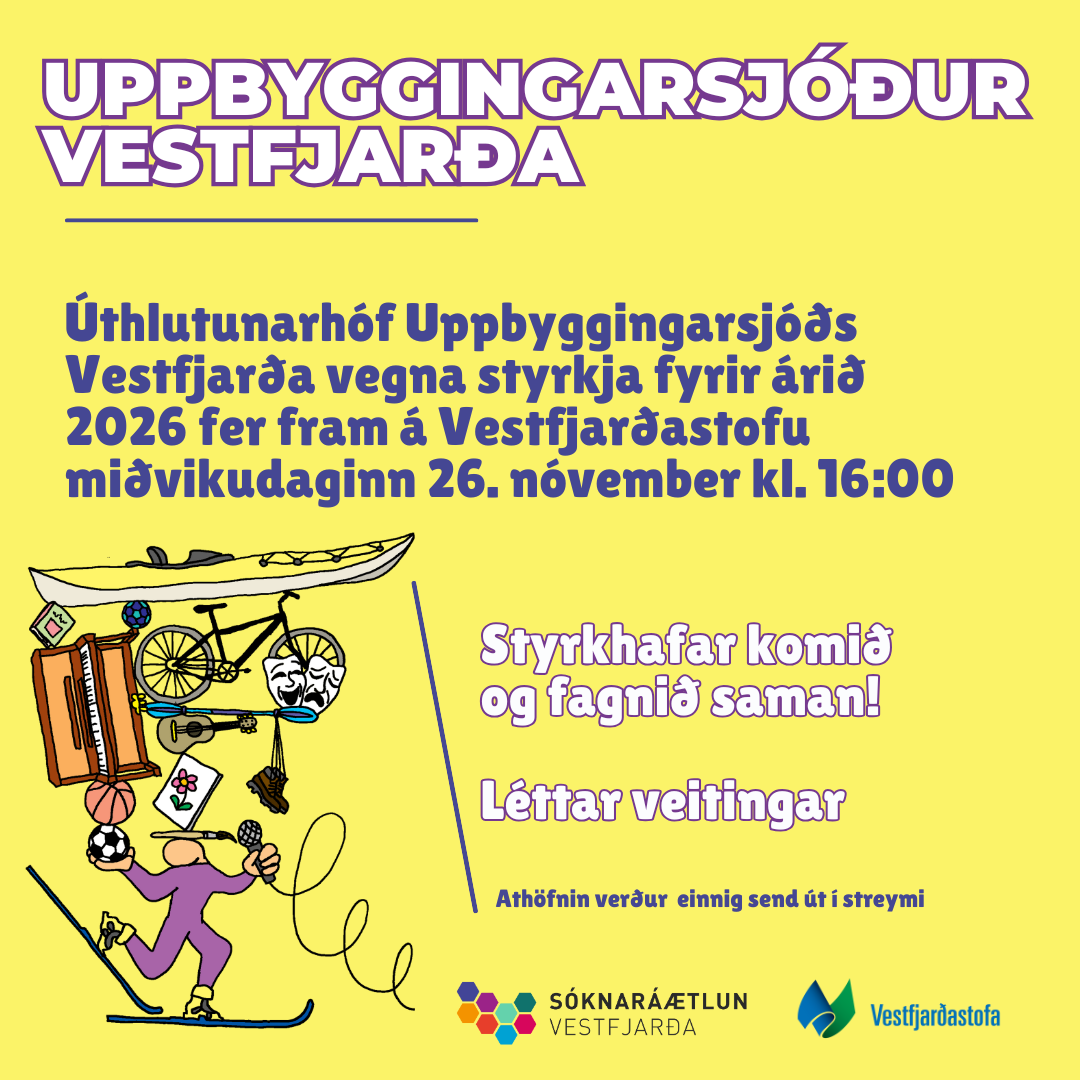 Úthlutunarhóf Uppbyggingarsjóðs Vesfjarða vegna styrkja fyrir árið 2026 fer fram í húsakynnum Vestfjarðastofu á Ísafirði miðvikudaginn 26. nóvember kl. 16. Styrkhafar eru sérstaklega hvattir til að mæta og gera sér glaðan dag. Boðið verður upp á léttar veitingar og skemmtiatriði.